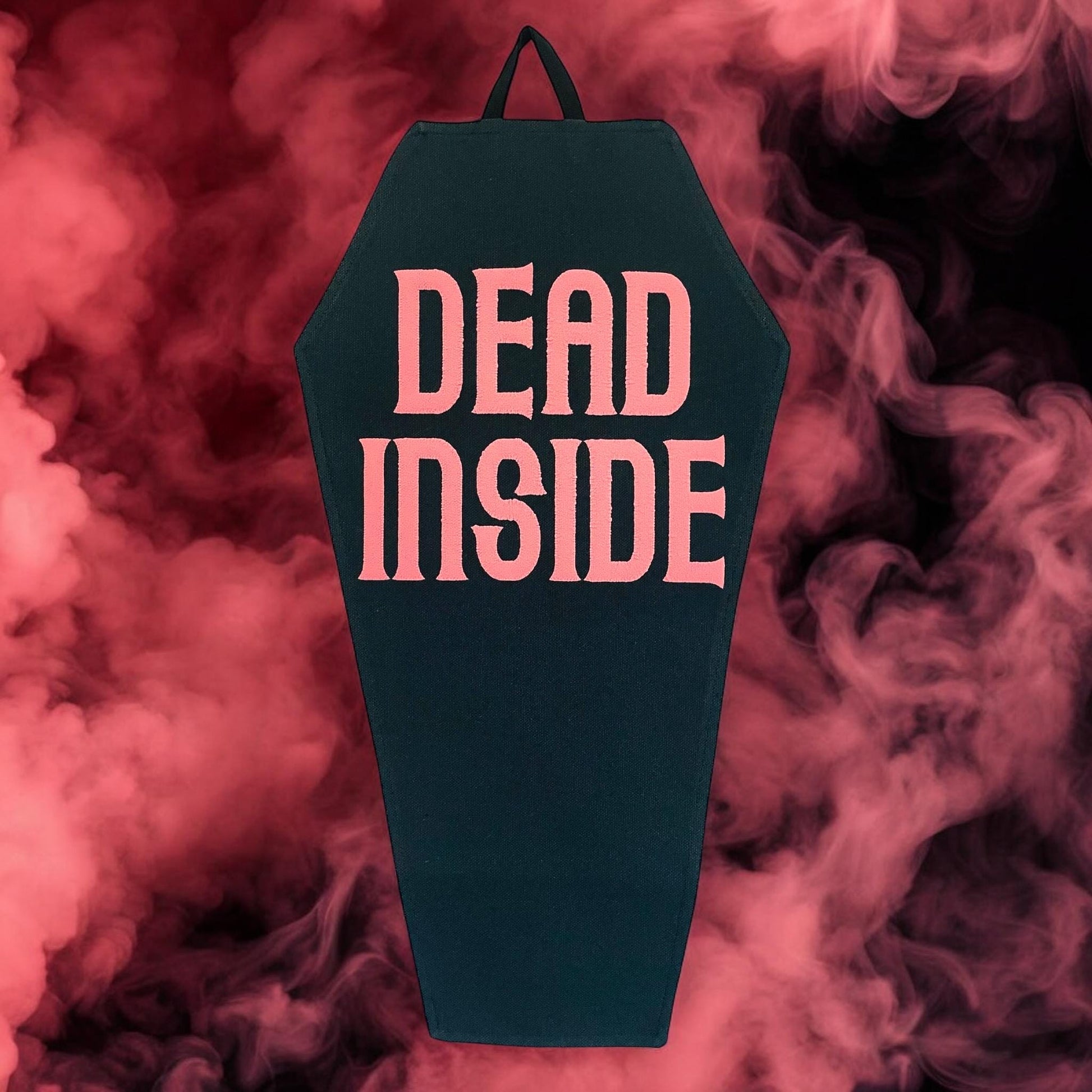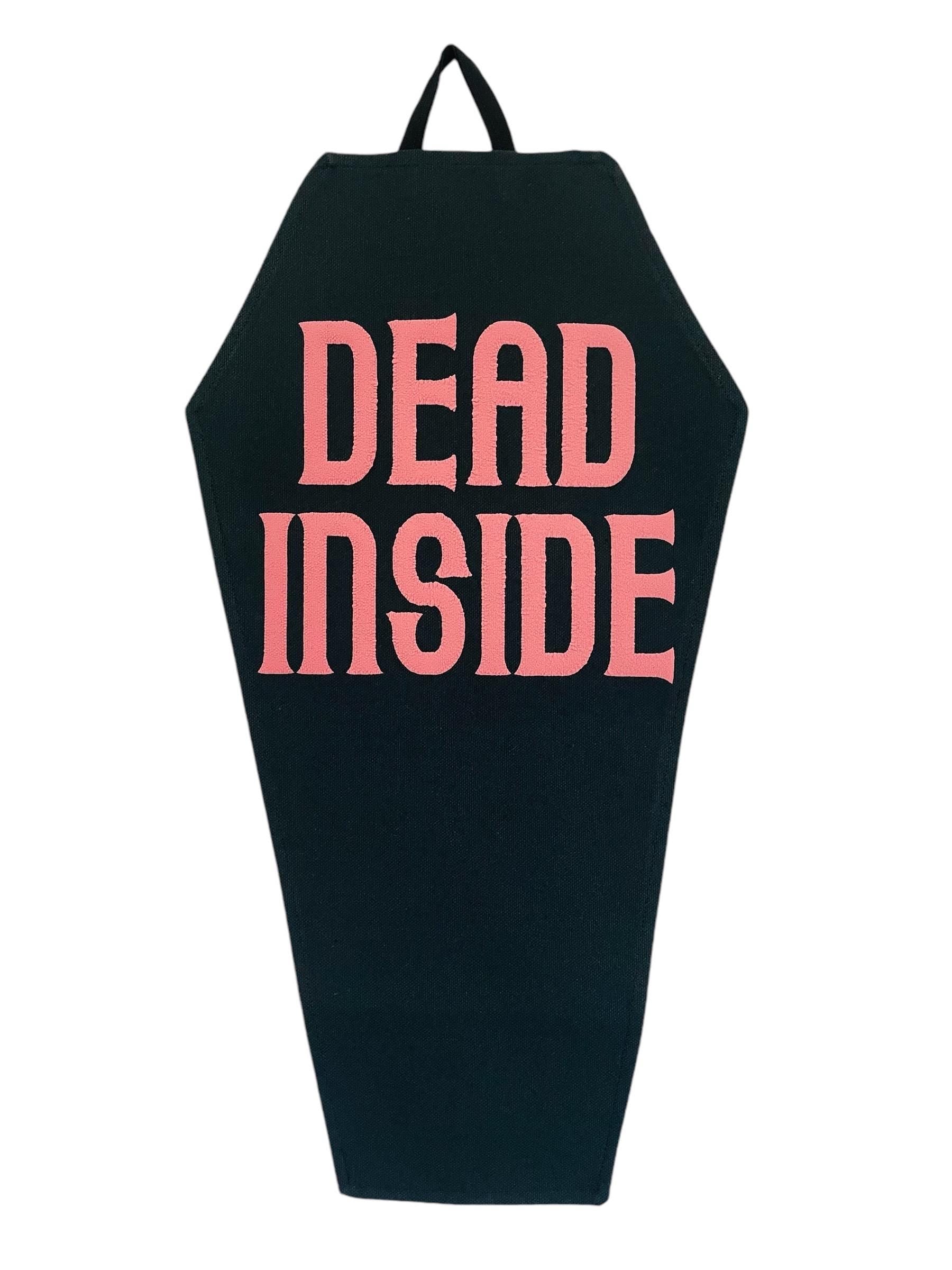 This coffin shaped wall hanging can be used as decor or as a pin display. Made with black duck canvas and decorated with pink puff vinyl.