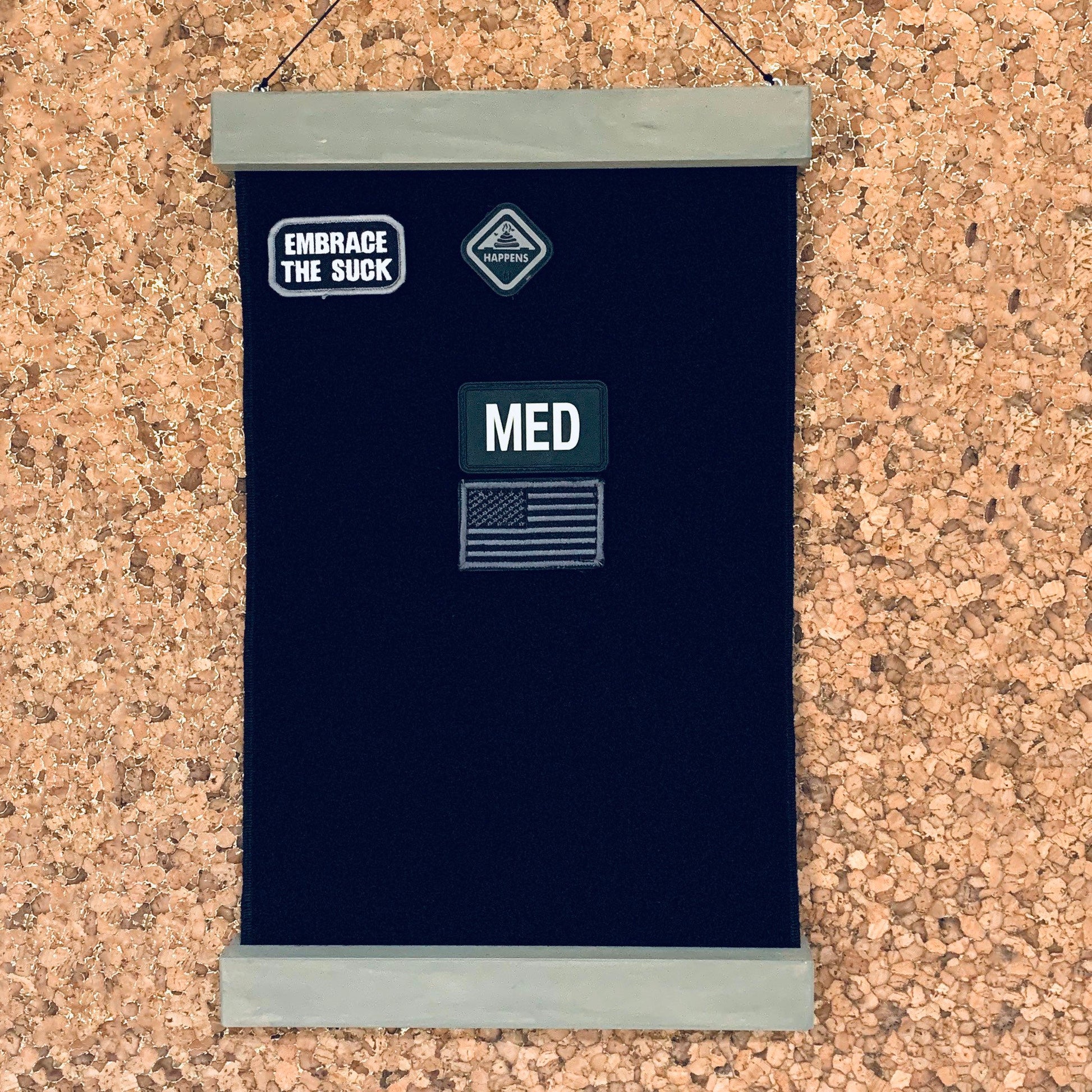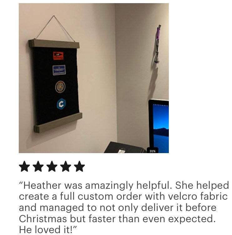 This wood and loop fabric banner is perfect for embroidered patches, scout patches, or military patches. It can also double as a display for your enamel pins. The wall hangings are made of black loop fabric which has been serged so it will not fray and it is nailed between 2 pieces of wood. There are 2 eye hooks at the top with twine for easy hanging. You can easily change out the twine with the material of your choice. If you would like the wood painted please leave the paint color in the notes to seller section at checkout. If you have patches without a backing I suggest getting hook and loop dots to add to the back so they can be easily displayed and rearranged.
